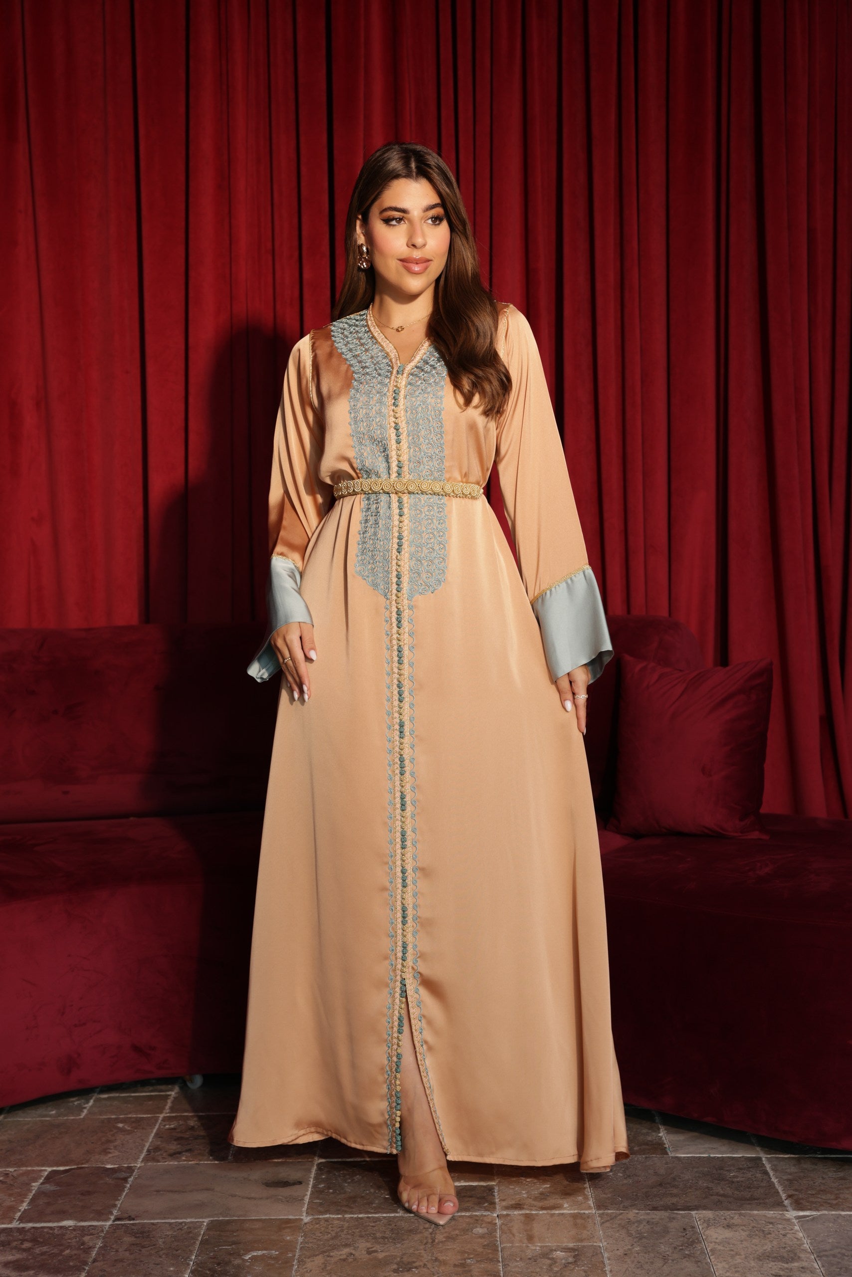 Step into elegance with this sky-blue satin kaftan, featuring peach contrast cuffs and intricate front embroidery. Finished with a golden embroidered belt, it’s perfect for festive gatherings and special occasions.