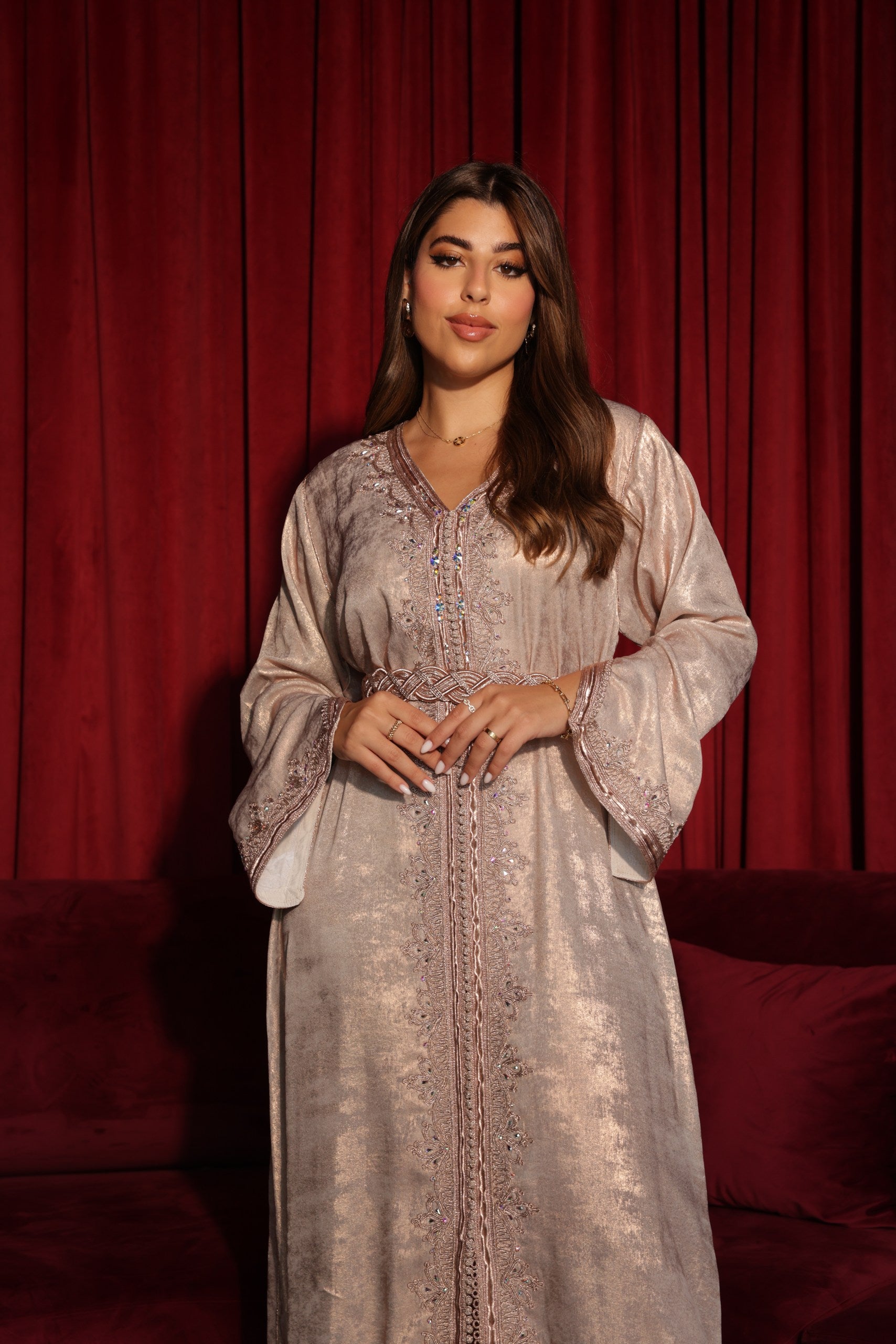 "Step into sophistication with our rose gold caftan. Crafted from shimmering textured fabric, it features intricate embroidery and delicate beadwork for a touch of elegance. The braided waist belt and flowing sleeves enhance your silhouette, making it perfect for weddings and special events. Complete your look with timeless charm."